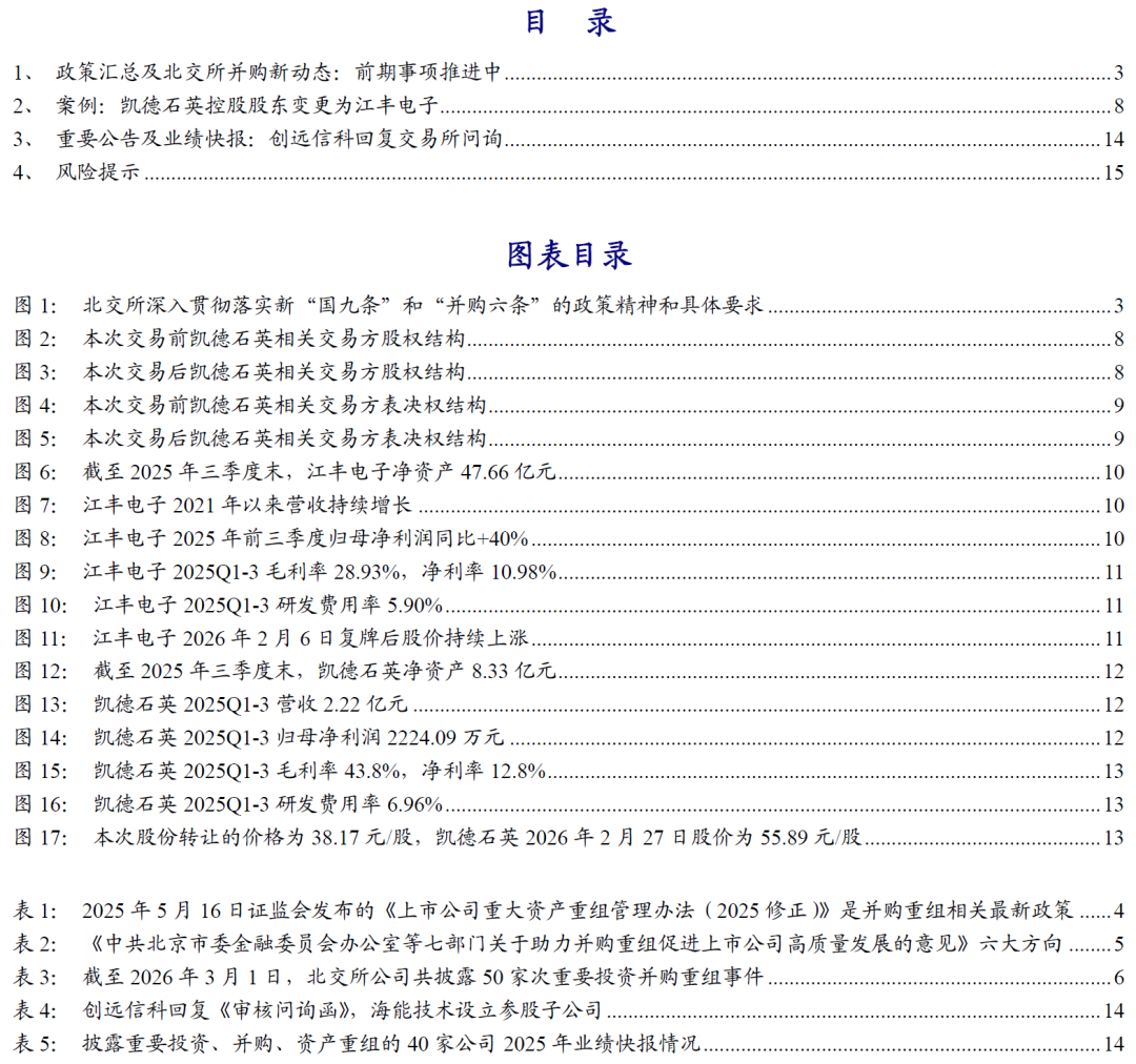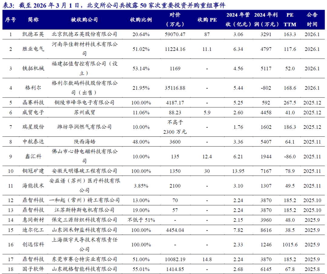 从新“国九条”到“并购六条”,2024年起,并购重组市场迎来了诸多积极信号。产业整合、跨界并购,为产业发展注入了新的动力。2025年10月29日,中共北京市委金融委员会办公室制定《北京市关于助力并购重组促进上市公司高质量发展的意见》,意见涵盖六条核心内容,其中特别提到发挥证券交易场所并购重组主阵地作用,支持北京证券交易所、全国中小企业股份转让系统股份有限公司发挥服务创新型中小企业主阵地优势,成为中小企业并购重组交易首选地,逐步做大影响力。我们认为,服务创新型中小企业的北交所能够及时把握并购机遇。在北交所公司并购的趋势方向上,应重点关注:(1)同一集团内优质资源整合;(2)新质生产力行业外延并购;(3)“强链补链”扩张版图式并购。截至2026年3月1日,北交所共发生50家次重要投资并购重组事件。