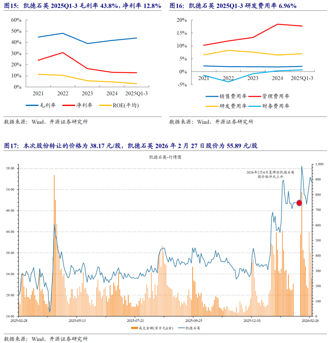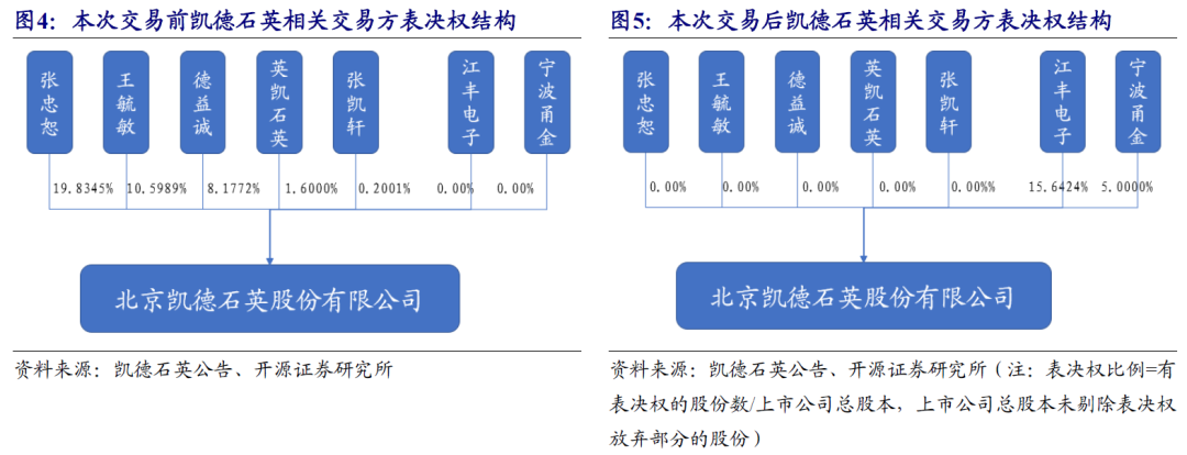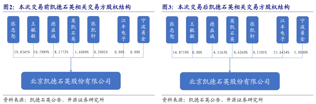 2026年2月5日,凯德石英实际控制人张忠恕、王毓敏及其一致行动人张凯轩、德益诚、英凯石英拟向江丰电子、宁波甬金转让其所持的上市公司共计1547.56万股股份(占上市公司总股本的20.6424%),并拟放弃转让完成后所持上市公司全部股份的表决权。本次交易完成后,江丰电子将成为公司控股股东。改选后凯德石英的总经理将由原董事长张忠恕先生担任。财务总监由江丰电子推荐(提名),其他高级管理人员由张忠恕先生提名。江丰电子专注超高纯金属溅射靶材及半导体精密零部件,2025年度受益于人工智能、5G 通信、云计算、机器人、交通运输等下游需求的持续增长,全球晶圆及芯片产量相应提升,并不断向先进制程方向发展。凯德石英:持续推动半导体&光伏石英制品高端化,2025年半导体集成电路行业用石英产品收入较2024年同期增加。双方产品应用领域存在较大程度重合,此次整合将扩大半导体产业链布局,增强客户服务能力。