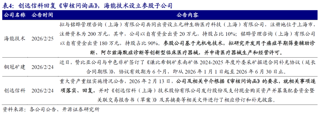 本周(2026.2.23~2026.3.1)值得关注的公告主要包括:创远信科回复北京证券交易所《审核问询函》,重大资产重组实施情况更新;海能技术设立参股公司元神生物医疗科技(上海)有限公司,其基于光机电技术,拟研究开发用于癌症早期筛查辅助诊断、阿尔兹海默症诊断等创新型临床医疗器械,并申请医疗器械生产和经营许可。