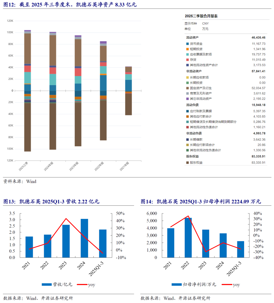 根据2025年业绩快报,预计实现营收2.83亿元同比-7.56%,归母净利润2327.66万元同比-29.26%。虽然受到光伏太阳能行业的周期性影响,但半导体集成电路行业用石英产品收入较2024年同期有所增加。