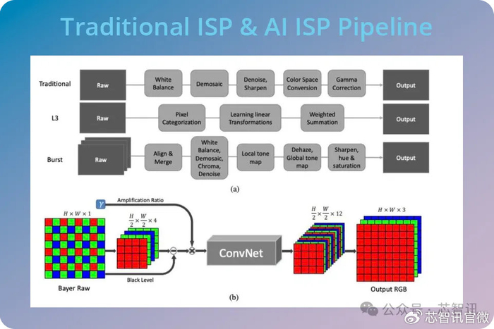 传统的图像信号处理(lmage Signal Processing, ISP) 主要是用于对图像传感器输出的原始图像信号进行处理和优化。其原理是将图像传感器接收到的光信息处理成图像信息,并通过系列数字图像处理算法对图像噪声、亮度、色彩等进行优化,让智能终端设备面对复杂多变的现实环境,拥有看清世界的能力。