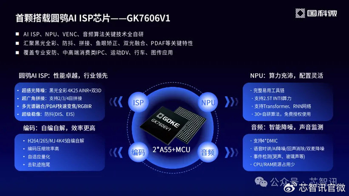 目前,首款基于圆鸮AI ISP的AI视觉处理芯片GK7606V1系列已在安防行业头部企业实现应用。据介绍,GK7606V1系列内置双核Cortex A55处理器,拥有最高2.5TOPS NPU算力,支持4K编解码、4K@25fps AI降噪,具有高画质、低码率、低内存、低延时以及低功耗等优势。可以满足专业安防、中高端消费类IPC、运动DV、行车记录仪、图传等应用。