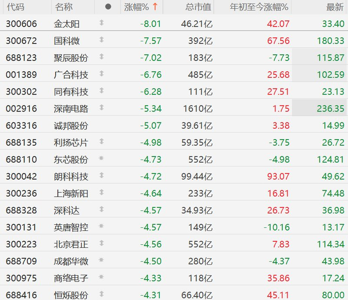 A股存储芯片股集体下跌,国科微、聚辰股份跌超7%