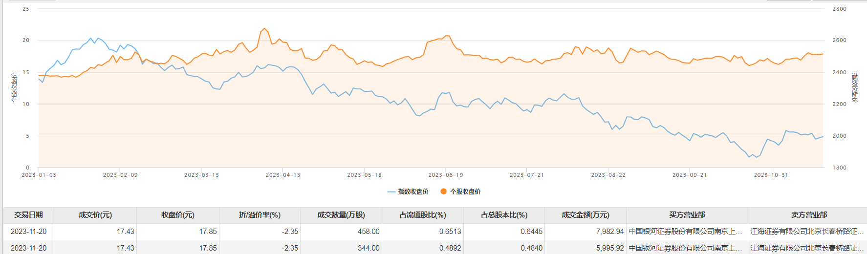11月20日大宗交易成交802万股,成交额1.4亿元,占当日总成交额的34.41%,成交价17.43元,较市场收盘价折价2.35%。