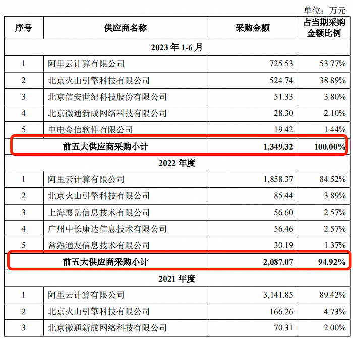 图 / 易诚互动招股书其中,阿里云计算有限公司(以下简称“阿里云”)是易诚互动的第一大供应商,报告期内,公司向阿里云的采购金额分别为2376.91万元、3141.85万元、1858.37万元、725.53万元,占当期采购比例分别为86.02%、89.42%、84.52%和53.77%。
