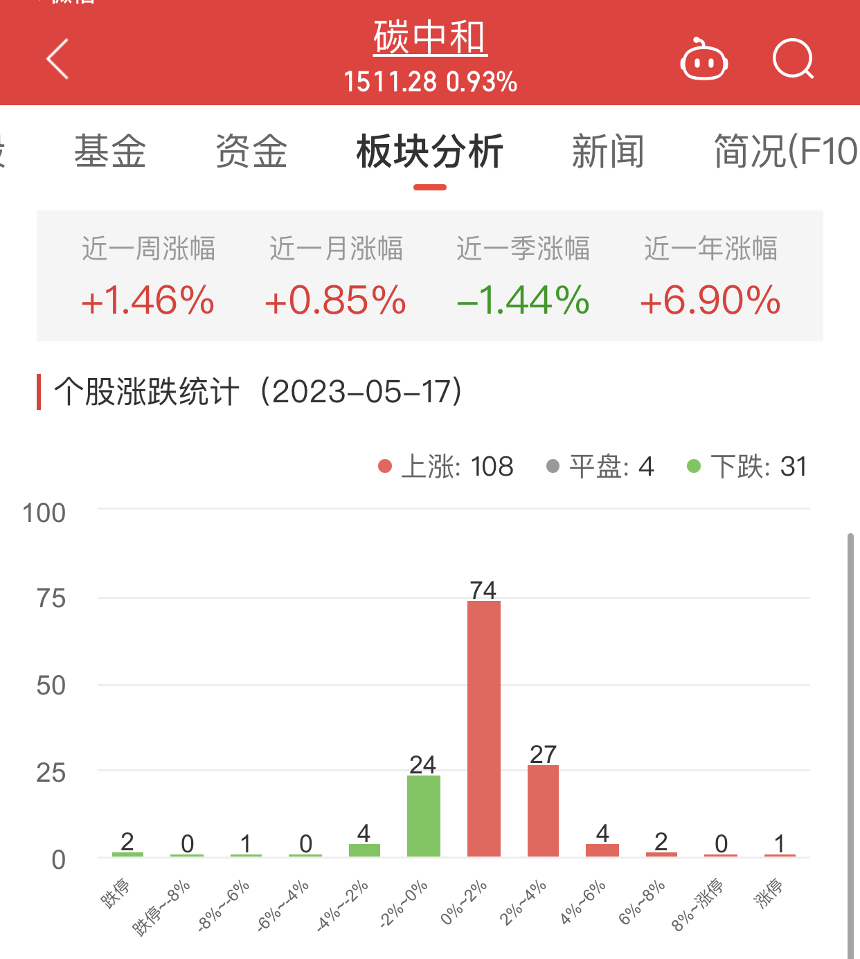 中国经济网北京5月17日讯 今日,碳中和板块整体涨幅0.93%,其中108只股票上涨,4只股票平盘,31只股票下跌。