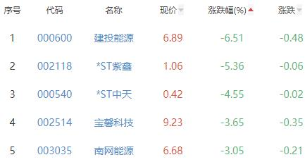建投能源、*ST紫鑫、*ST中天、宝馨科技、南网能源位列涨幅榜后五位,涨幅分别为-6.51%、-5.36%、-4.55%、-3.65%、-3.05%。