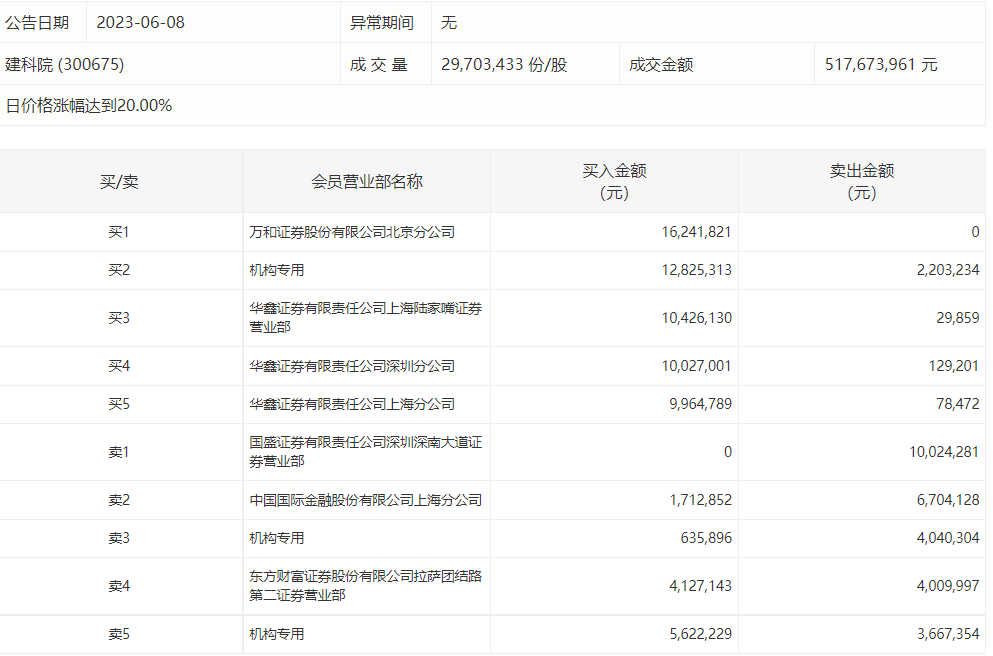 6月8日,建科院今日涨停,龙虎榜数据显示,上榜营业部席位全天成交1.02亿元,占当日总成交金额比例为19.79%。其中,买入金额为7158.32万元,卖出金额为3088.68万元,合计净买入4069.63万元。