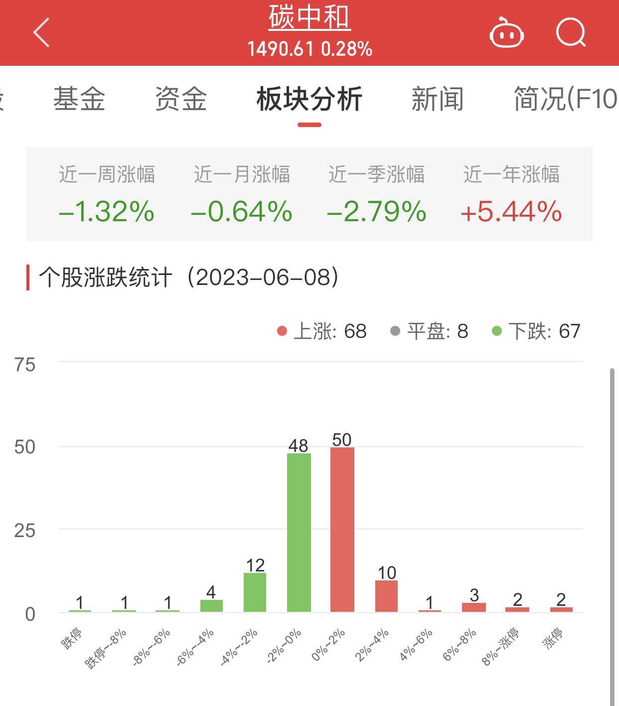 中国经济网北京6月8日讯 今日,碳中和板块整体涨幅0.28%,其中68只股票上涨,8只股票平盘,67只股票下跌。
