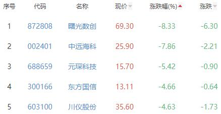 曙光数创、中远海科、元琛科技、东方国信、川仪股份位列涨幅榜后五位,涨幅分别为-8.33%、-7.86%、-5.42%、-4.66%、-4.63%。