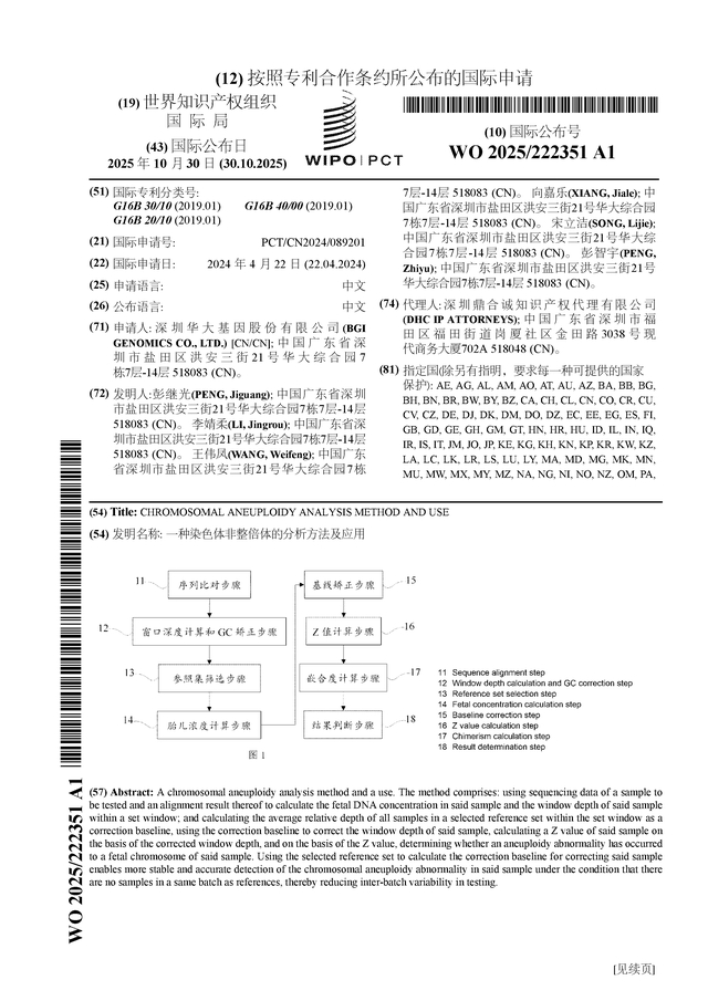 华大基因公布国际专利申请:“一种染色体非整倍体的分析方法及应用”