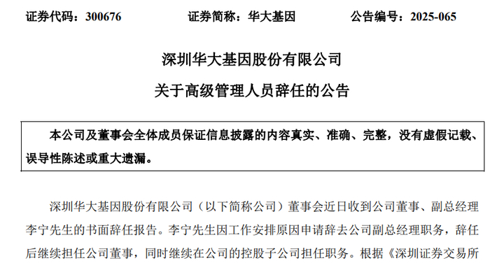 公告显示,华大基因董事会近日收到董事、副总经理李宁的书面辞任报告。李宁因工作安排原因,申请辞去副总经理职务,辞任后将继续担任公司董事,并在公司控股子公司任职。李宁原定高级管理人员任期为2024年6月18日至2027年6月17日。