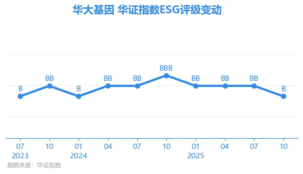 日前,华证指数公布了新一期(2025年10月31日)的ESG评级结果,华大基因(300676.SZ)获得B评级(华证指数评级为C起至AAA九档,C为最低档,AAA为其最高一级评级/AA为其第二档),上一期(2025年7月31日)ESG评级为BB。本期ESG评级在75家生物科技行业A股上市公司中排名第40(上一期排名第28)。