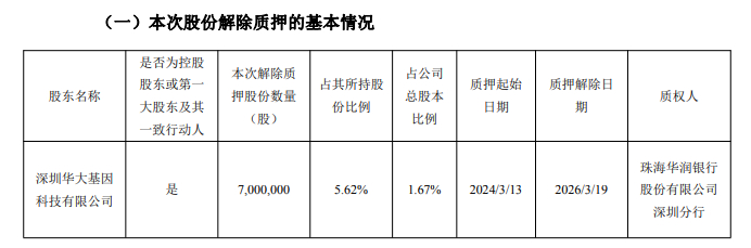 深圳华大基因科技有限公司本次解除质押股份数量为700万股,占其所持股份比例为5.62%,占公司总股本比例为1.67%,质押起始日期为2024年3月13日,解除日期为2026年3月19日。质权人为珠海华润银行股份有限公司深圳分行。