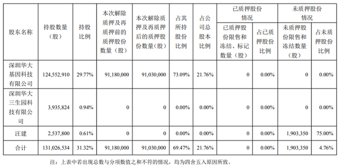 深圳华大基因科技有限公司持股1.246亿股,持股比例为29.77%,本次解除质押及再质押后的质押股份数量为9103万股,占其所持股份比例为73.09%,占公司总股本比例为21.76%。