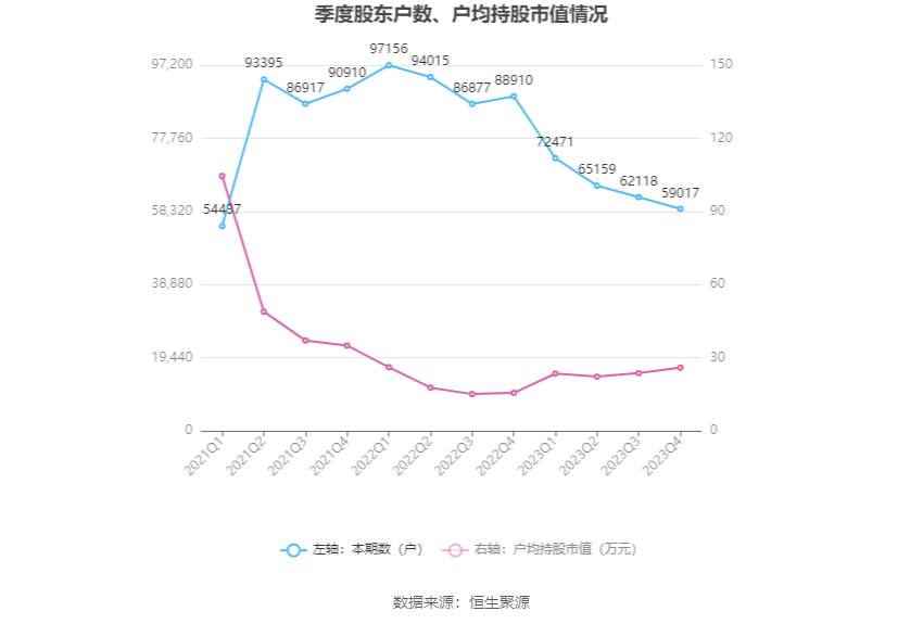 筹码集中度方面,截至2023年年末,公司股东总户数为5.9万户,较三季度末下降了3101户,降幅4.99%;户均持股市值由三季度末的23.71万元上升至25.97万元,增幅为9.53%。