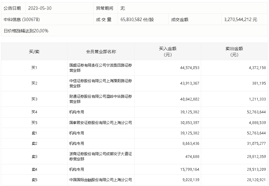 5月30日,中科信息今日涨停,龙虎榜数据显示,上榜营业部席位全天成交4.15亿元,占当日总成交金额比例为12.7%。其中,买入金额为2.33亿元,卖出金额为1.82亿元,合计净买入5112.78万元。