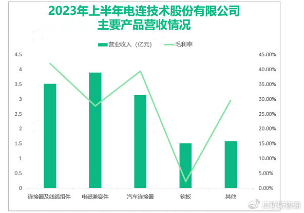 2023年上半年,电连技术实现总营收13.65亿元,较上年同期下降9.25%;归属于上市公司股东的净利润为1.25亿元,同比下降35.80%。其中,公司汽车连接器产品2023年半年度出货量同比保持高速增长,随着公司汽车连接器业务规模效应显现,工艺流程进一步优化,汽车连接器业务盈利水平保持相对稳定。