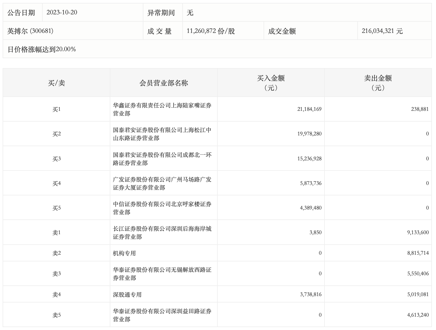 10月20日,英搏尔今日涨停,全天换手率达6.52%,振幅达10.72%。龙虎榜数据显示,营业部席位合计净买入3703.43万元。其中,机构合计净卖出881.57万元。此外,华鑫证券上海陆家嘴证券营业部、国泰君安证券上海松江中山东路证券营业部分别买入2118.42万元、1997.83万元;长江证券深圳后海海岸城证券营业部、华泰证券无锡解放西路证券营业部分别卖出913.36万元、555.04万元。