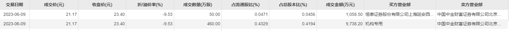 6月9日大宗交易成交510万股,成交额1.08亿元,占当日总成交额的24.64%,成交价21.17元,较市场收盘价23.4元折价9.53%。