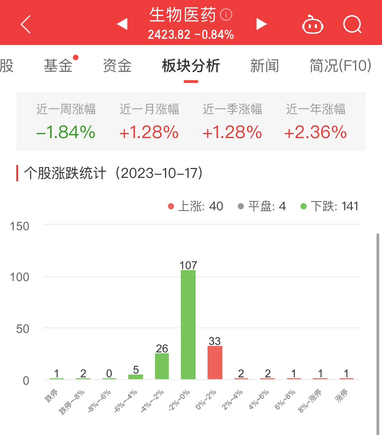 中国经济网北京10月17日讯今日,生物医药板块整体跌幅0.84%,其中40只股票上涨,4只股票平盘,141只股票下跌。