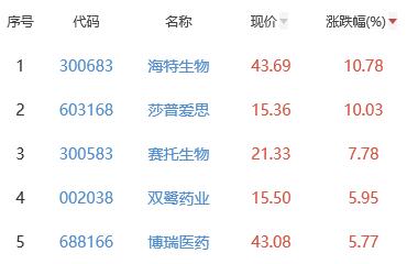 其中,海特生物、莎普爱思、赛托生物、双鹭药业、博瑞医药(维权)位列板块涨幅前五位,涨幅分别为10.78%、10.03%、7.78%、5.95%、5.77%。