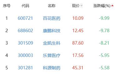 百花医药、康鹏科技、金凯生科、乐普医疗、科源制药位列涨幅榜后五位,涨幅分别为-9.99%、-9.78%、-8.21%、-5.95%、-5.58%。