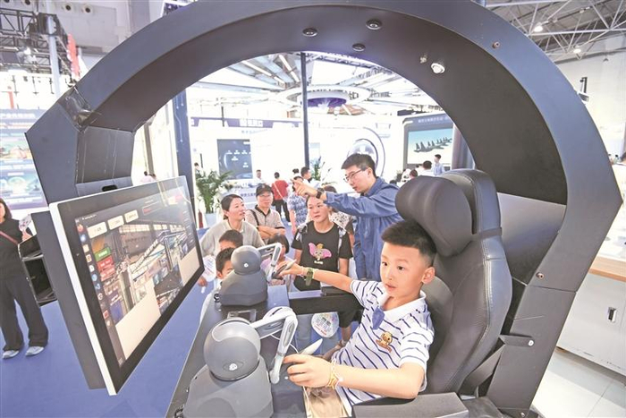 2025中国国际大数据产业博览会展馆,一名小朋友在操控悟空带电作业机器人。 赵松 摄(影像贵州)