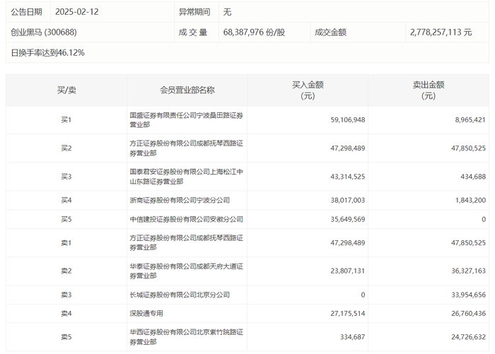 具体来看,知名游资现身龙虎榜,宁波桑田路(国盛证券宁波桑田路证券营业部)、方正证券成都抚琴西路证券营业部分别买入5910.69万元、4729.85万元;方正证券成都抚琴西路证券营业部、华泰证券成都天府大道证券营业部分别卖出4785.05万元、3632.72万元。