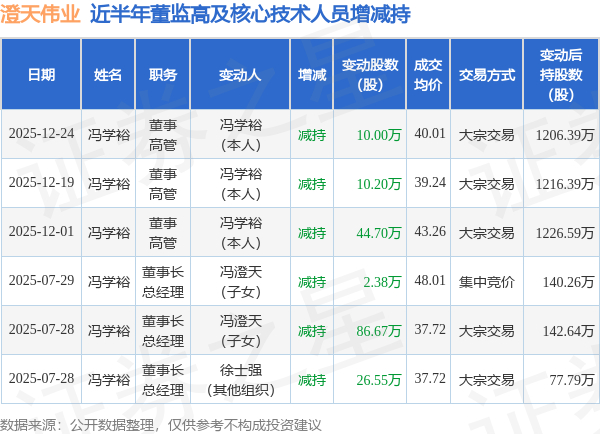 澄天伟业:12月24日高管冯学裕减持股份合计10万股