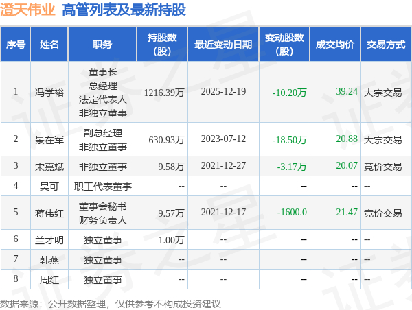 澄天伟业的高管列表及最新持股情况如下: