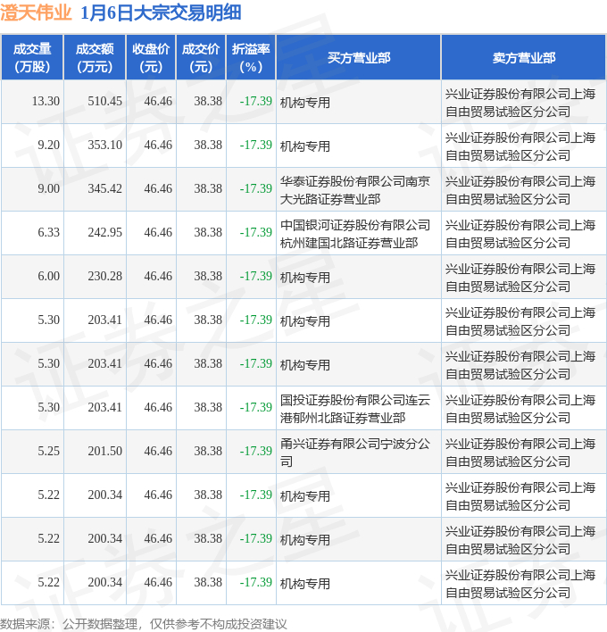 1月6日澄天伟业现12笔折价17.39%的大宗交易 合计成交3094.95万元