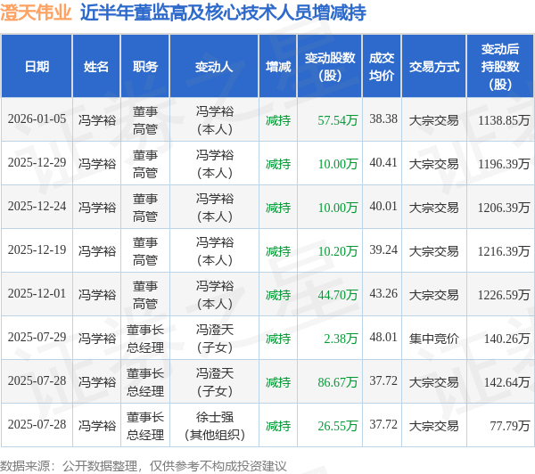 澄天伟业近半年内的董监高及核心技术人员增减持详情如下: