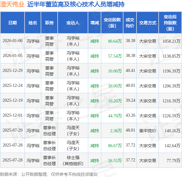 澄天伟业近半年内的董监高及核心技术人员增减持详情如下: