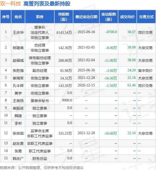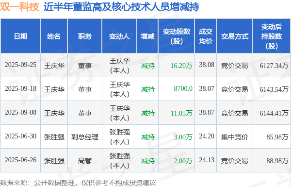 双一科技:9月25日高管王庆华减持股份合计16.2万股