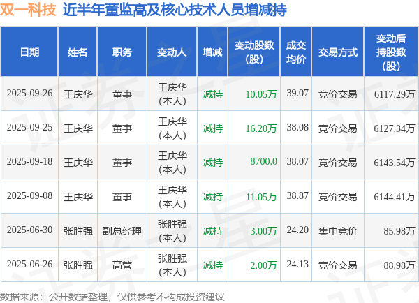 双一科技:9月26日高管王庆华减持股份合计10.05万股