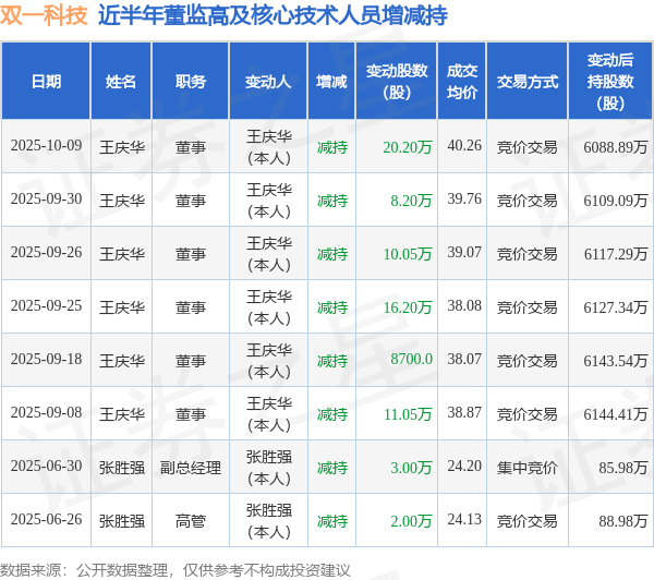双一科技近半年内的董监高及核心技术人员增减持详情如下: