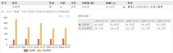 据东方财富网数据,双一科技董事长王庆华2024年所获薪酬为60.03万元,相较上年薪酬56.02万元微涨。
