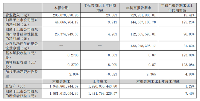 报告显示,双一科技公司前三季度营业收入为7.30亿元,同比增长15.41%;归母净利润为1.45亿元,同比增长125.25%;扣非归母净利润为1.13亿元,同比增长96.83%;基本每股收益0.87元。