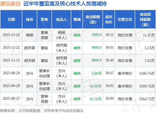 盛弘股份近半年内的董监高及核心技术人员增减持详情如下: