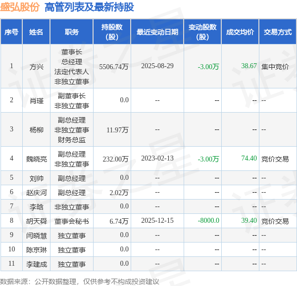 盛弘股份的高管列表及最新持股情况如下: