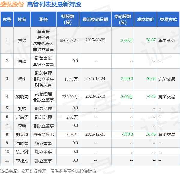 盛弘股份的高管列表及最新持股情况如下: