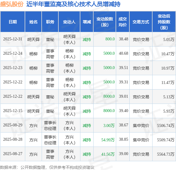 盛弘股份近半年内的董监高及核心技术人员增减持详情如下: