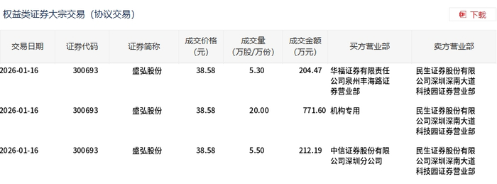 1月16日,盛弘股份大宗交易成交30.8万股,成交额1188.26万元,占当日总成交额的1.7%,成交价38.58元,较市场收盘价41.21元折价6.38%。