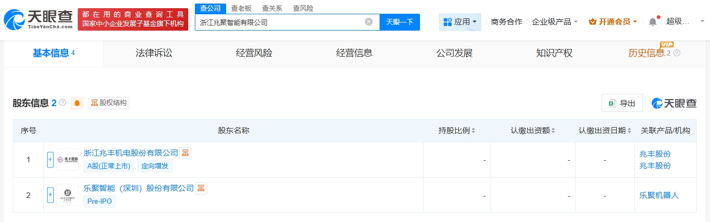 每经AI快讯,天眼查工商信息显示,近日,浙江兆聚智能有限公司成立,法定代表人为孔辰寰,注册资本1000万元人民币,经营范围包括工业机器人制造、人工智能应用软件开发、大数据服务、数据处理服务、互联网数据服务等。股东信息显示,该公司由兆丰股份(300695)、乐聚智能(深圳)股份有限公司共同持股。
