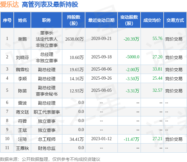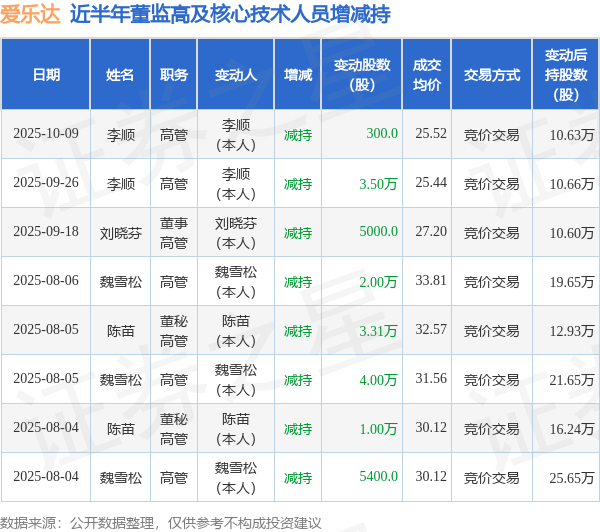 爱乐达近半年内的董监高及核心技术人员增减持详情如下:
