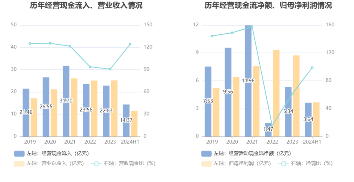 2024年上半年,公司营业收入现金比为124.30%,净现比为98.94%。