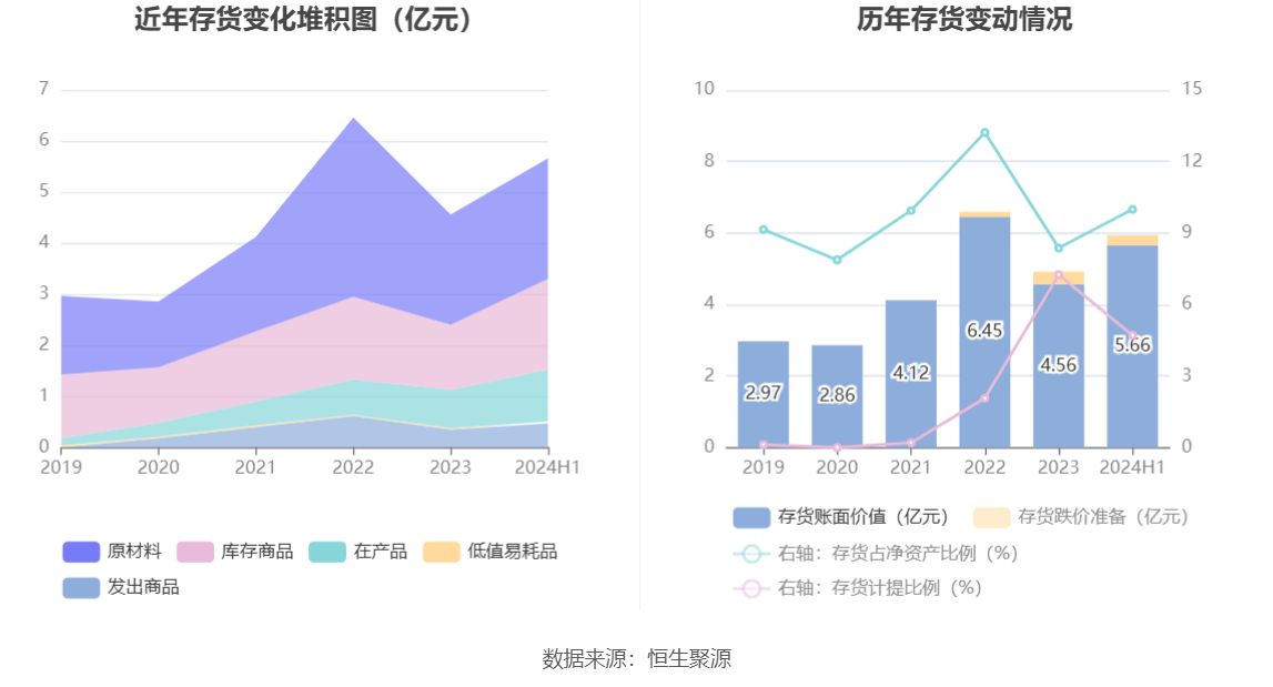 从存货变动来看,截至2024年上半年末,公司存货账面价值为5.66亿元,占净资产的9.99%,较上年末增加1.1亿元。其中,存货跌价准备为2796.72万元,计提比例为4.71%。