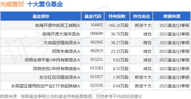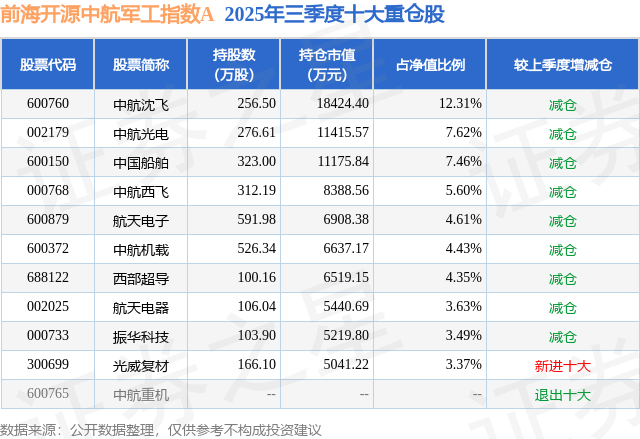 根据2025基金Q3季报公募基金重仓股数据,重仓该股的公募基金共8家,其中持有数量最多的公募基金为前海开源基金的前海开源中航军工指数A。前海开源中航军工指数A目前规模为11.16亿元,最新净值1.1537(1月7日),较上一交易日下跌0.53%,近一年上涨33.28%。该公募基金现任基金经理为黄玥。黄玥在任的基金产品包括:前海开源中证军工指数A,管理时间为2017年2月21日至今,期间收益率为29.01%;前海开源中证大农业指数增强A,管理时间为2019年11月4日至今,期间收益率为11.56%;前海开源MSCI中国A股消费A,管理时间为2020年12月18日至今,期间收益率为-23.56%。