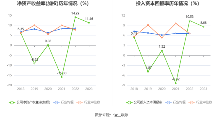 数据显示,2023年公司加权平均净资产收益率为11.46%,较上年同期下降2.83个百分点;公司2023年投入资本回报率为8.68%,较上年同期下降1.85个百分点。